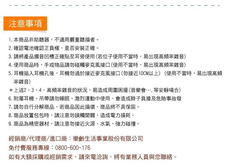 附屬品:耳機套、4號電池2入、吊繩、產品說明書(保證書)