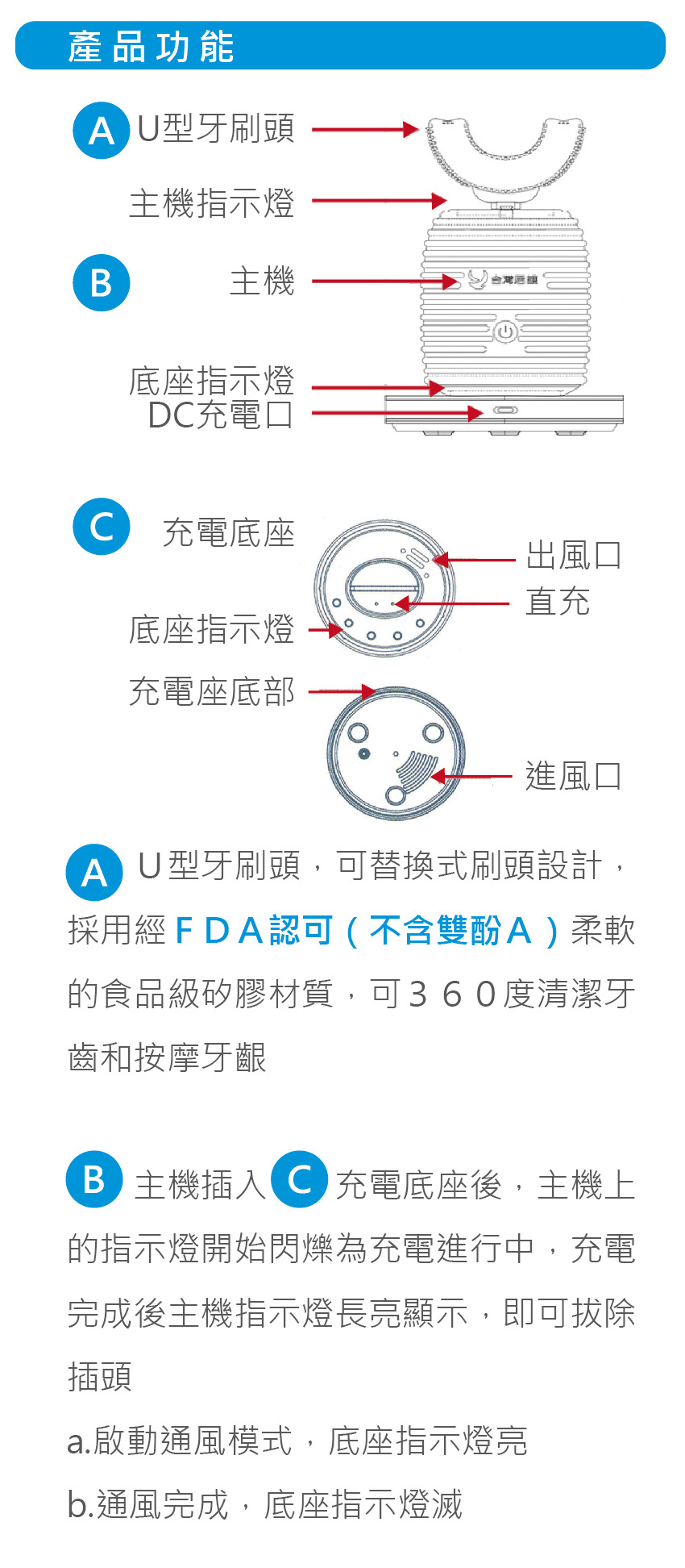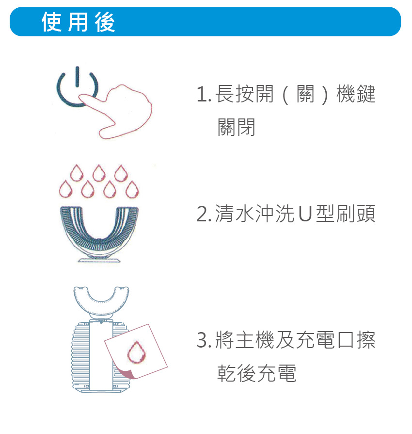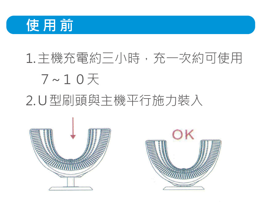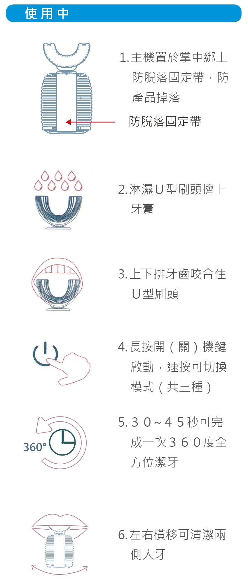 U型刷頭設計,上下排牙齒咬住,30~45秒即可完成一回360度的潔牙,左右橫移也能清潔兩側大牙,三種速度模式可選,不傷害牙齦,是幫助銀髮族維持口腔健康的好幫手!